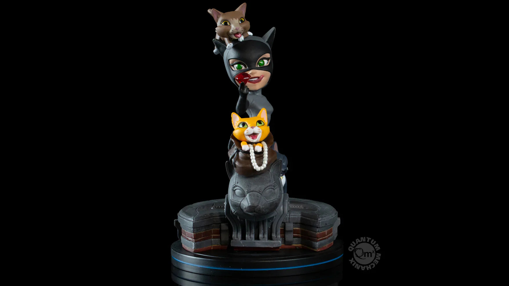 Inspirée de son apparition dans Batman : la série animée, la Catwoman Q-Fig Elite présente Selina Kyle accompagnée de ses véritables amours : une meute de félins amicaux et une énorme pierre précieuse libérée d'un collectionneur local. Nous avons sculpté Catwoman pour capturer parfaitement ses méfaits espiègles, ainsi que pour restituer un haut degré de détail dans son costume, les chatons et la gargouille sur laquelle elle se tient.