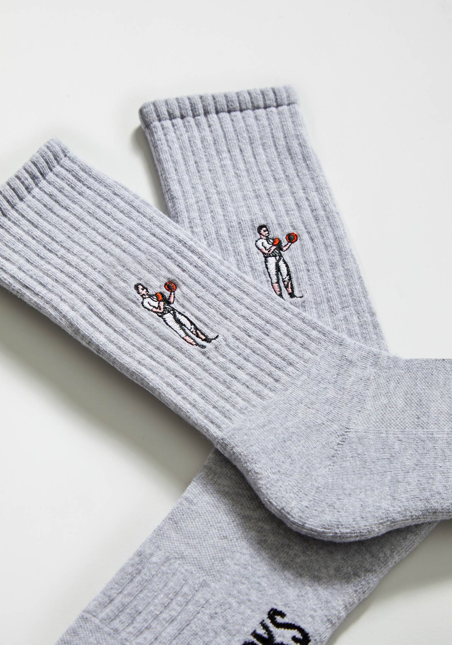 Chaussettes grises avec un design brodé et un style sportif fabriquées en coton 100 % biologique. Hauteur mi-mollet. Idéal pour les tenues de style streetwear.