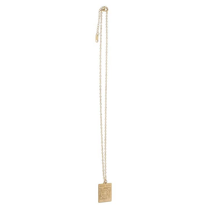 Ce collier pendentif doré présente le design de la carte de tarot La Roue de la Fortune, symbolisant la chance et la joie. Présenté sur une carte de vœux magnifiquement illustrée, il constitue un cadeau attentionné pour les amateurs de tarot et pour célébrer les moments précieux de la vie. Acier inoxydable sans nickel. Comprend une enveloppe assortie. Carte laissée vierge à l'intérieur. Conçu par Something Different Wholesale et faisant partie de la collection Vintage Tarot de cadeaux mystiques et de décoration intérieure.