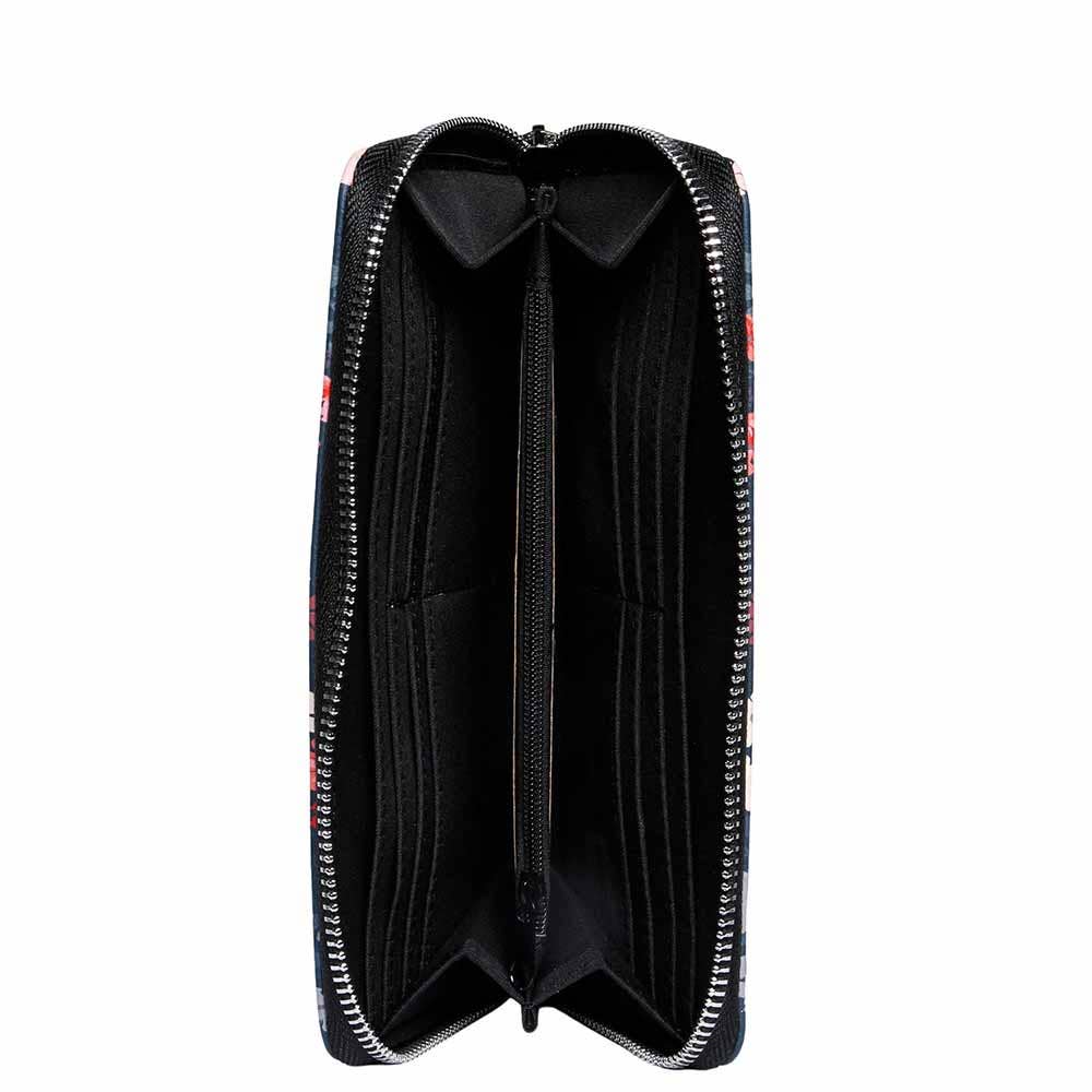 Portefeuille avec 12 compartiments pour cartes de crédit, 2 compartiments pour les billets et un compartiment central pour la monnaie fermé par un zip.
