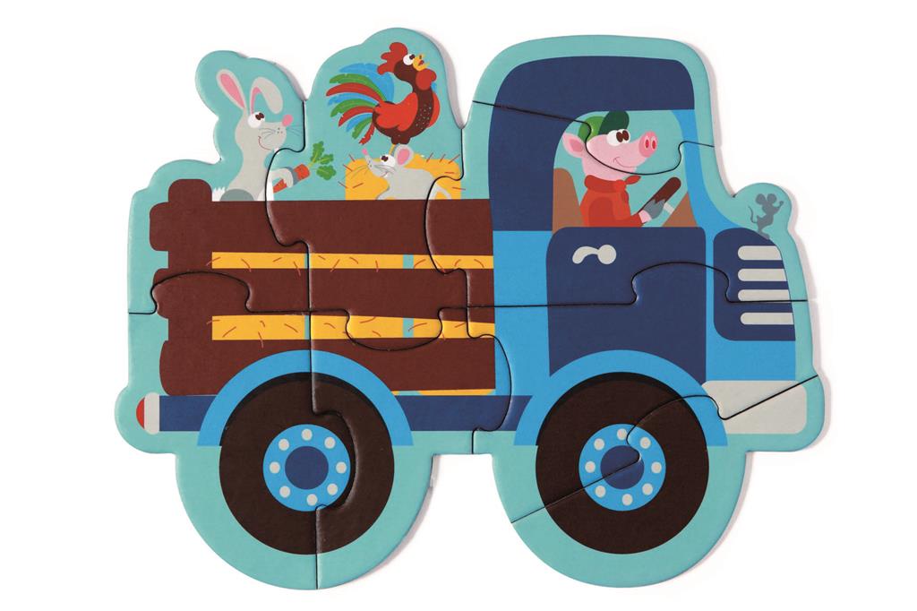 Amusement garanti grâce à ces puzzles évolutifs sur le thème de la ferme. 5 puzzles joliment illustrés pour les plus petits. Cinq figurines amusantes à assembler : lapin (3 pièces), paon (4 pièces), coq (5 pièces), tracteur (6 pièces) et camion (8 pièces).
