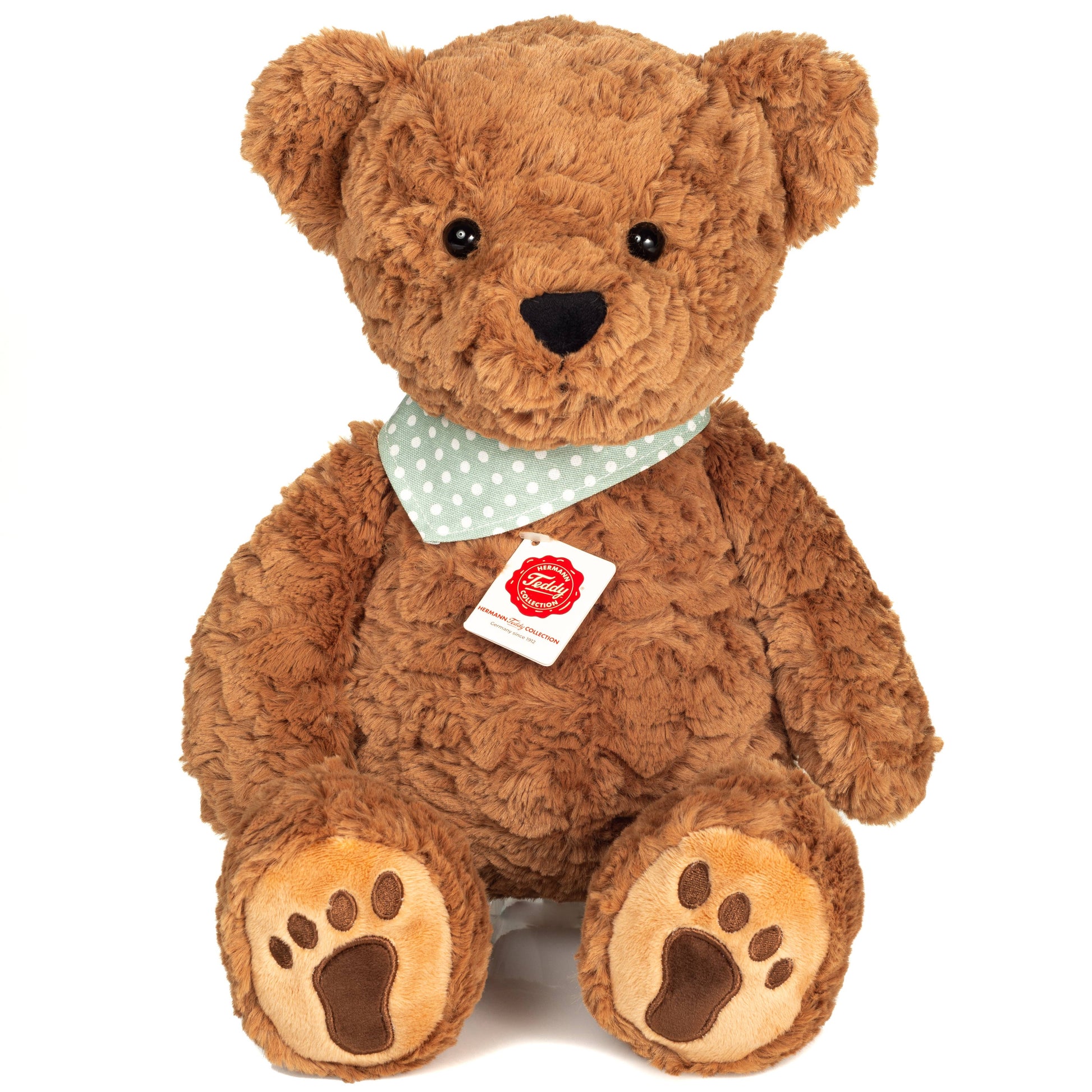 Cet ours en peluche enchanteur mesure 45 cm de haut et est un véritable ami pour les câlins ! Avec sa fourrure douce en peluche marron, il est très moelleux et parfait pour les moments de tendresse. Cet ours est un excellent compagnon pour tout enfant, idéal pour jouer et rêver. Son look classique est sublimé par un foulard vert clair à pois blancs et des pattes brodées. Un objet de tradition chaleureux qui embellira n'importe quelle maison.