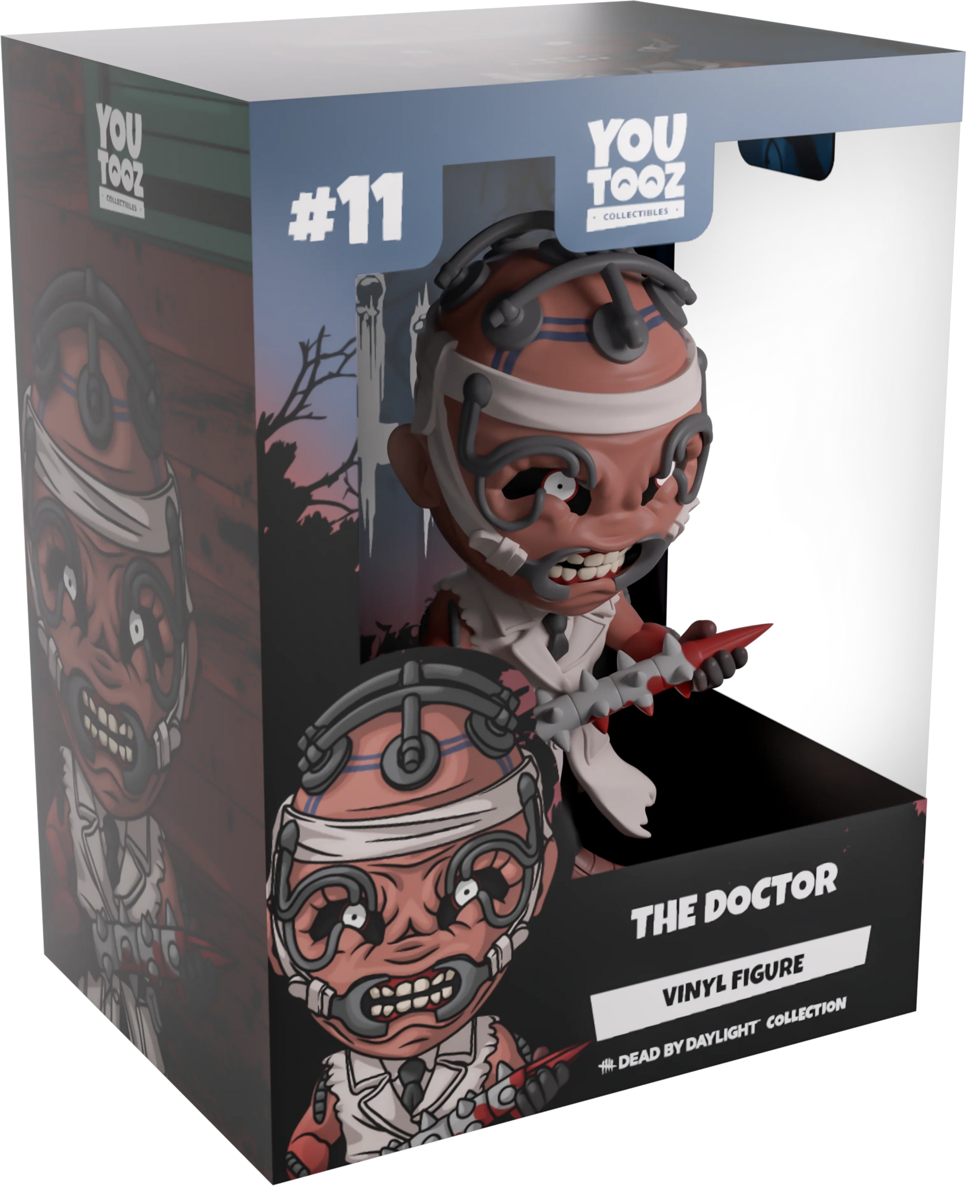 Prêt pour l'opération ? Eh bien, le Docteur est là et il est prêt à couper même si vous ne l'êtes pas ! Debout, préparé et prêt à 11,7 cm de hauteur, le Docteur tient sa pointe sanglante de manière menaçante dans ses deux mains alors qu'il est vêtu d'un pantalon noir, d'une veste marron et d'une longue blouse blanche en lambeaux déchirée aux manches et cintrée à la taille avec une ceinture noire. Avec son visage noueux déformé en un grognement involontaire, l'appareil métallique attaché à sa tête lui tire la bouche et les yeux ouverts. La boîte de présentation à fenêtre a été conçue pour présenter le Docteur derrière l'ouverture d'une porte pour vous accueillir dans son cabinet. Alors que l'intérieur est une forêt à silhouette noire avec une brume rouge et bleue brillante et le logo blanc « Dead by Daylight » à l'arrière, ce motif sinistre se poursuit ensuite sur la pochette de protection avec des arbres sombres qui l'entourent complètement tandis que leur silhouette peut être vue à travers la grande fenêtre transparente à l'avant. Cet objet de collection est livré dans une pochette extérieure protectrice mate et gaufrée et un protecteur en plastique de taille personnalisée pour une protection maximale pendant l'expédition.