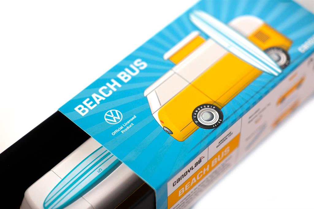 Le Beach Bus est de retour ! Désormais sous licence officielle de VW - regardez l'emblème brillant à l'avant. Cet emblématique Volkswagen Type 2 est livré avec un toit de camping magnétique et une planche de surf.