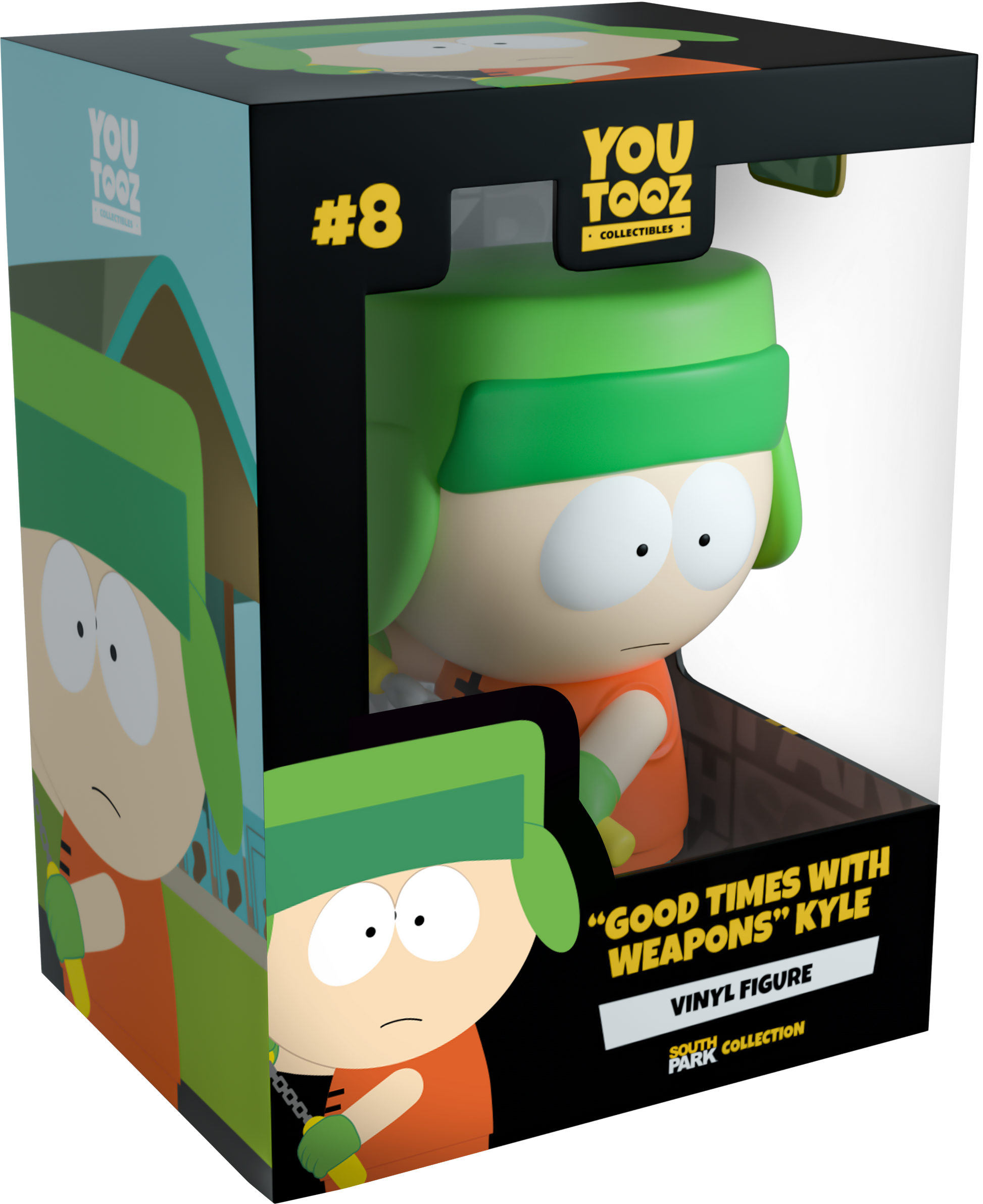 Kyle makes his Youtooz debut as his ninja persona Bunraku, a deadly but compassionate ninja who protects those in trouble. At 3.4 inches tall he stares forward and grips a pair of nunchaku across his front, its chain held taught and ready for an onslaught. He wears a warm green flapped hat and matching gloves, his bright orange shirt is sleeveless orange for optimum mobility of course. The exterior of his packaging shows the glass cases of the weapon ‘shop’ where the boys procured their arms. While the interior is a simple greyscale repeating pattern of the South Park Logo The protective sleeve shows the four boys' faces peeking from the corners of the packaging over a rich black background. This collectible ships in a matte, embossed, protective outer sleeve and a custom sized plastic protector for maximum protection during shipping.