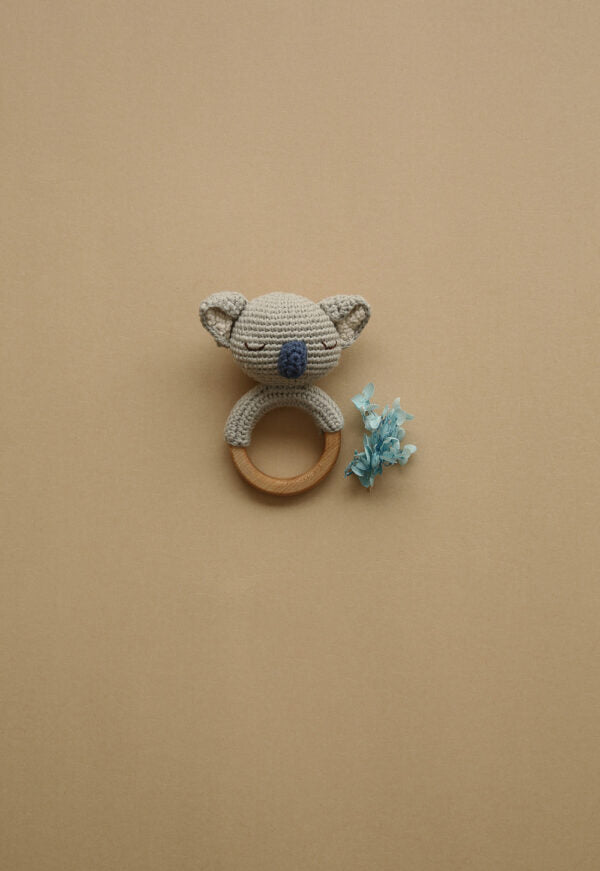 This adorable koala has a bell inside that makes a nice sound when it is shaken. The wooden ring is perfect for relieving baby gums.