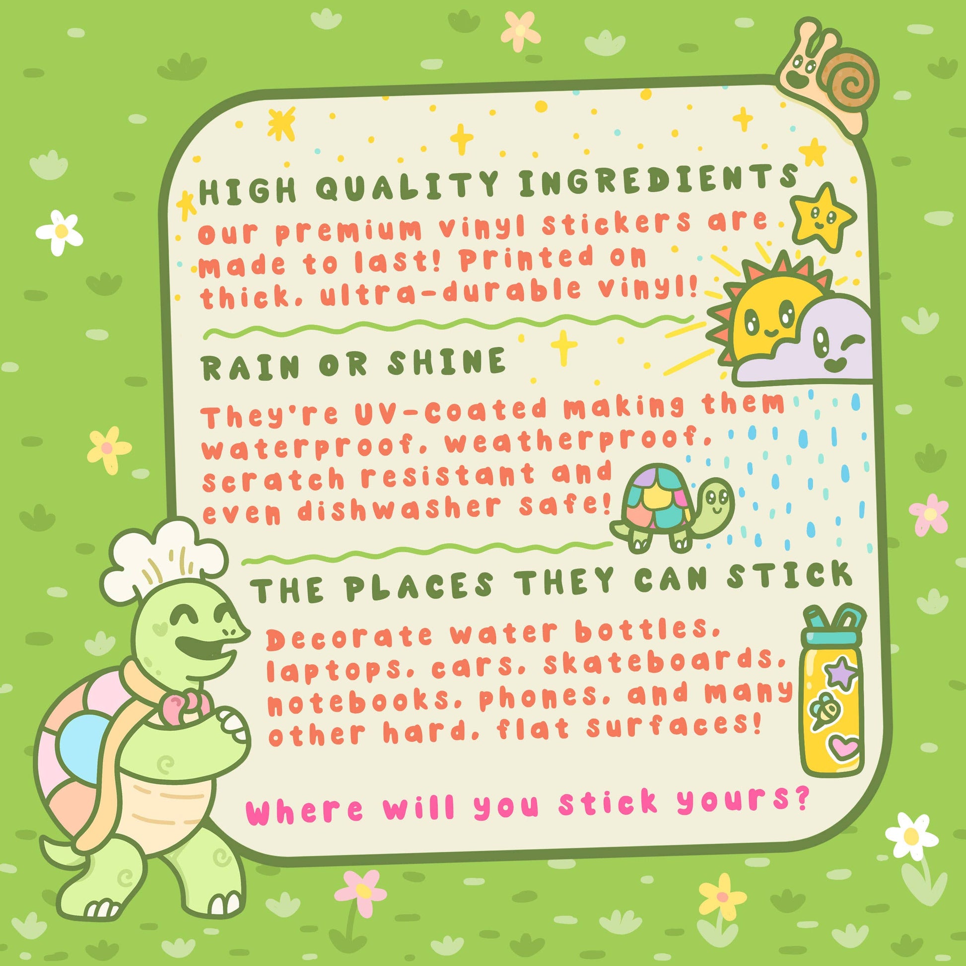 🐢 Our Turtley Awesome vinyl stickers are made from the highest quality ingredients on the market! Printed on thick, ultra-durable vinyl, these stickers are made to last. They have a UV coating, making them waterproof, weatherproof, and dishwasher safe!