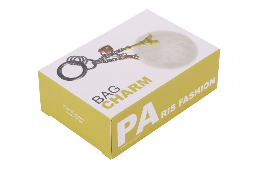 Golden Eiffel Tower with pink key and padlock, white pompom