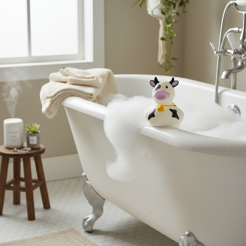 Of course wearing a bell around the neck - in the shape of a bath duck. In your bathtub or on a shelf, you will also feel comfortable as in green meadows.