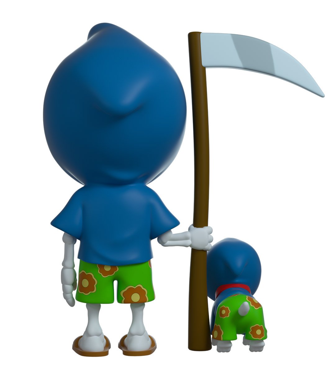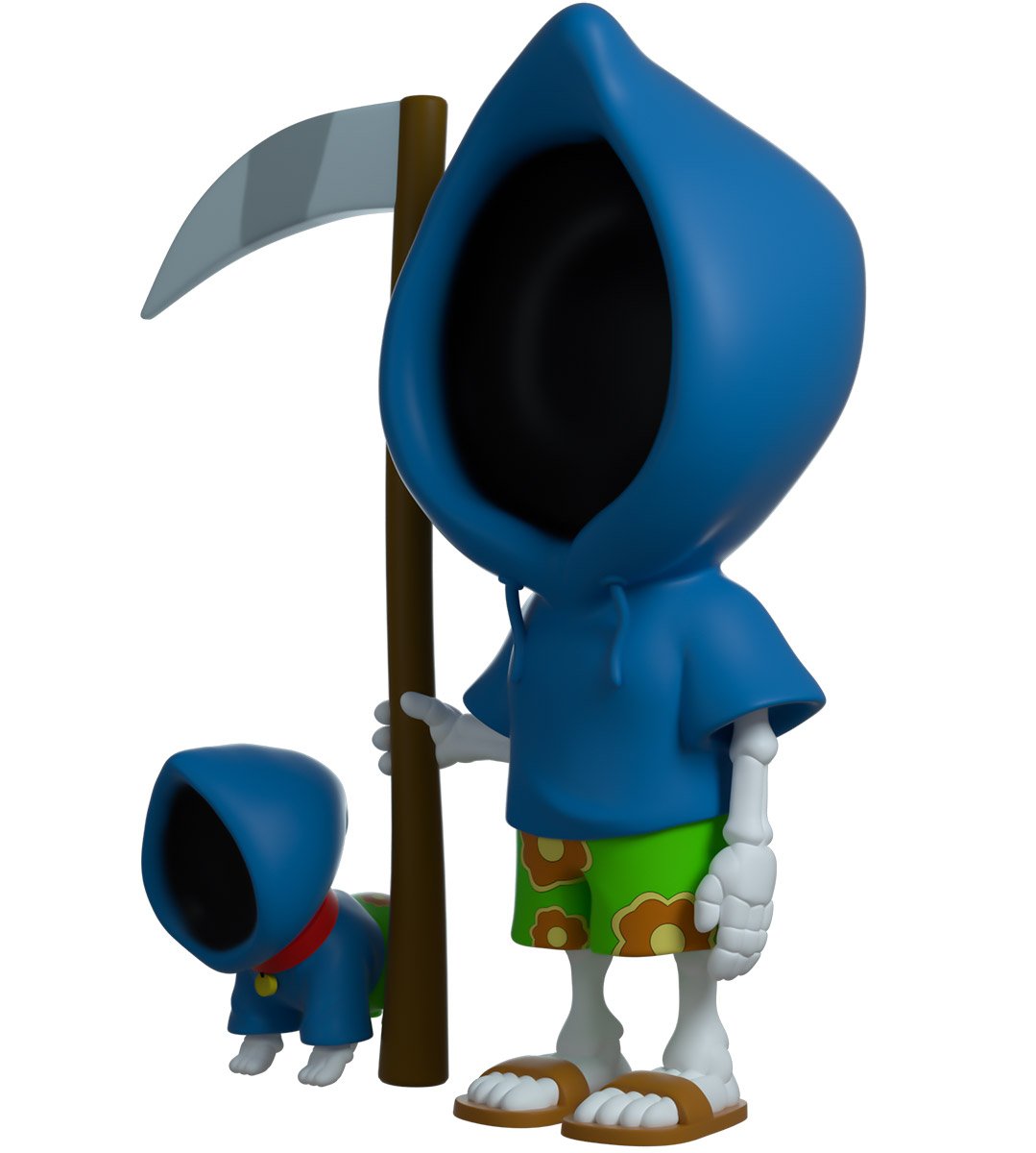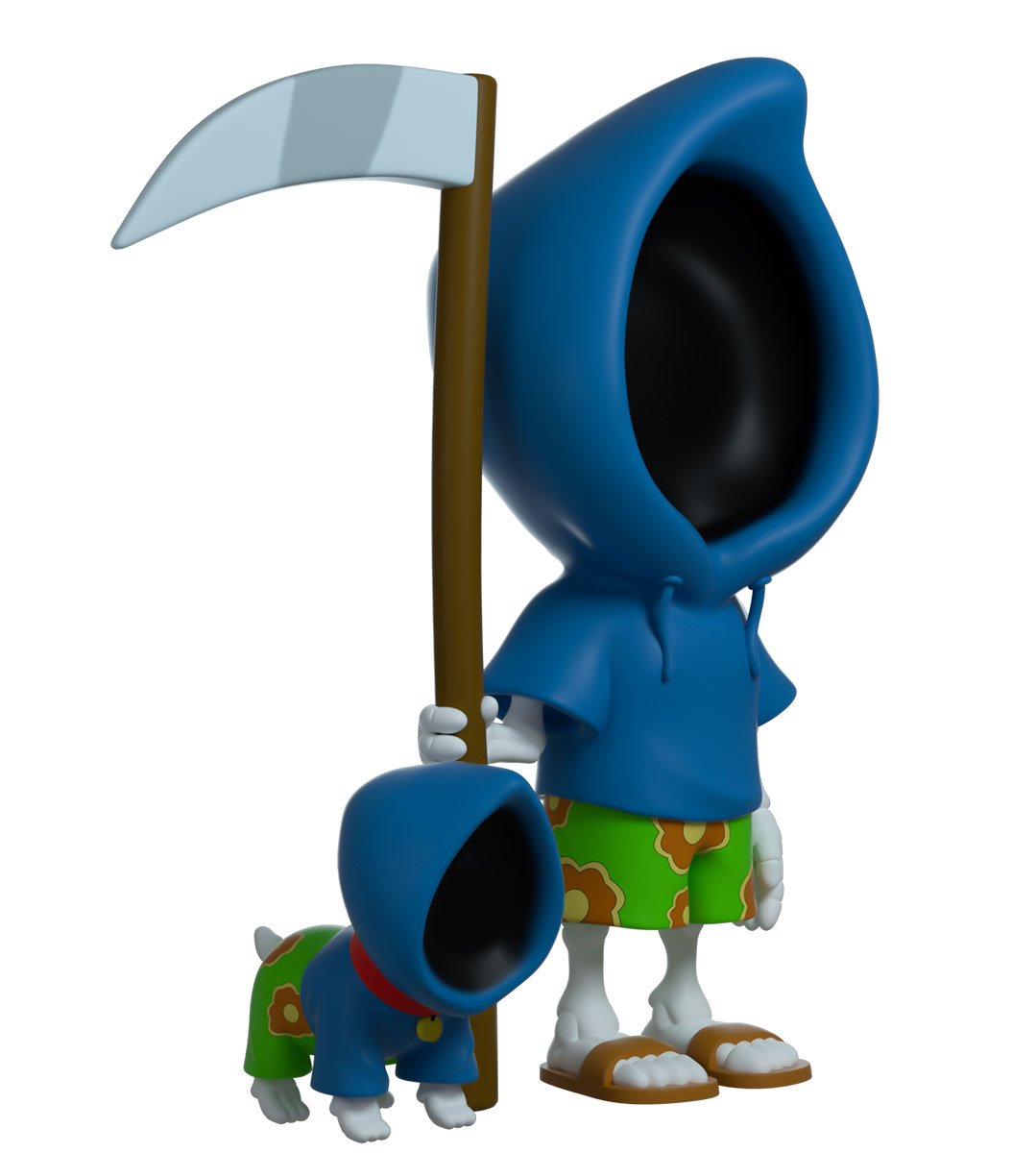 Death stands 4.5 inches tall, ready to soak up the sun and surf the waves at the beach. In his right hand, he holds his trusty scythe. With his face in shadow, he wears a blue hoodie with green swimsuits with a tropical flower pattern. He is paired with his dog who is right next to him. The exterior of his double-walled packaging features the beach, a beautiful sunny day with towels spread out on the sand. The interior is a red background with the Family Guy logo pattern. The protective sleeve is the iconic scene with the red and gold curtains that is shown in the title sequence. This collectible comes in a protective matte, embossed outer sleeve and a custom-sized plastic protector for maximum protection during shipping.