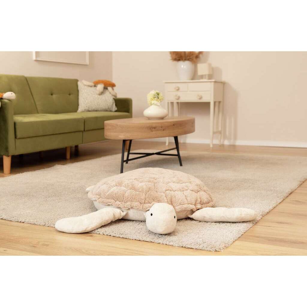 Our large, sand-colored turtle-shaped friend from Senger-Naturwelt's "Sea Animals" collection is handcrafted from GOTS-certified organic cotton. It's incredibly soft and versatile. Thanks to its removable cushion filled with organic spelt hulls, it quickly transforms into a comfortable pouf. Perfect for cuddles or as a stylish decorative element in your home. Durable, cozy, and simply charming!