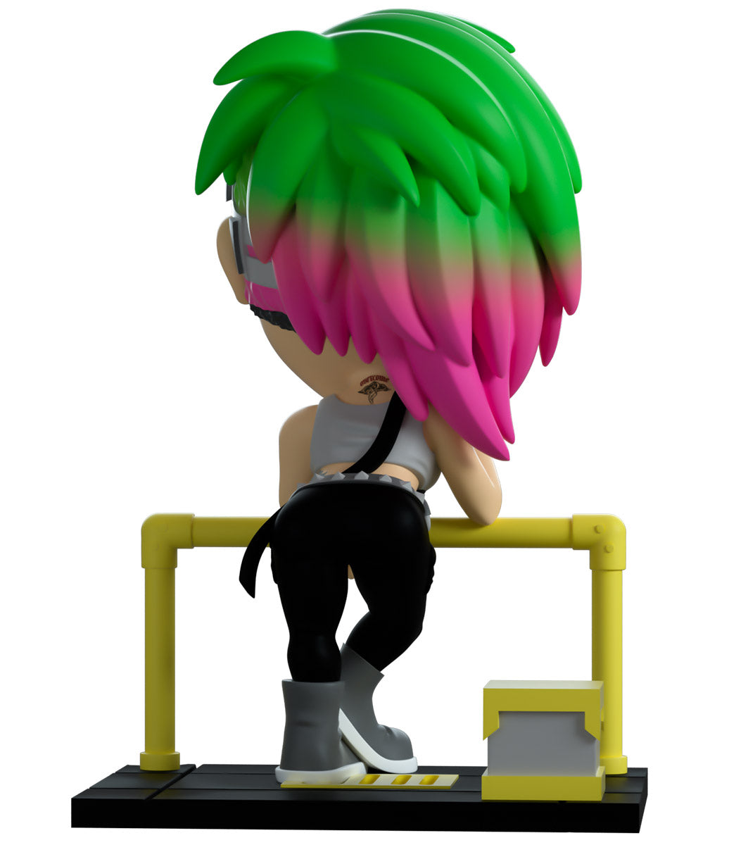 Wait, rewind that! Now change the frequency... No doubt about it, this is Judy's first Youtooz! Taking a break from a hard day of brain-dancing scans to relax as best she can, a lit cigarette dangles from her fingers as she leans forward on a bright yellow railing to look out. With gray cybernetic clothing resting on the shaved side of her undercut, shoulder-length green hair with pink tips sweeps to the side to rest near the hand supporting her head. With dark red lipstick and wearing a simple gray tank top that highlights her tattoos, her black overalls are held up by a strap over her shoulder as she presses the toe of a gray sneaker to the ground. The outside of her packaging shows Judy leaning on a yellow railing looking out over a dark nighttime city. While the interior is a bright yellow and features a silhouette of the night city with the “Cyberpunk 2077” logo, this then continues onto the protective sleeve where its silhouette can be seen through the large clear display window on the front. This collectible comes in a protective matte, embossed outer sleeve and a custom-sized plastic protector for maximum protection during shipping.