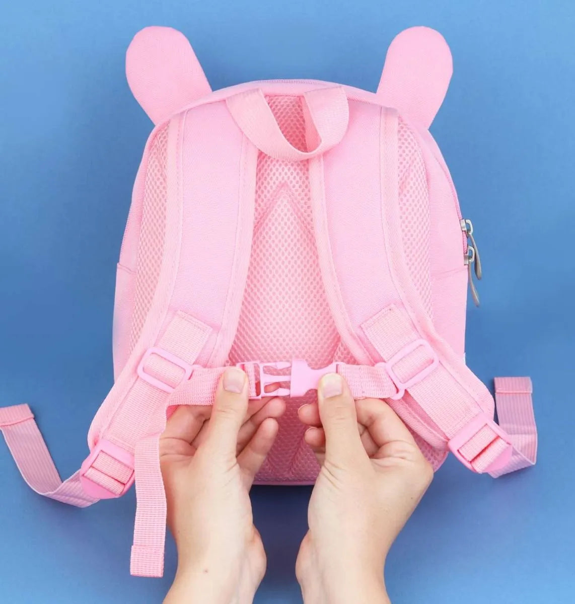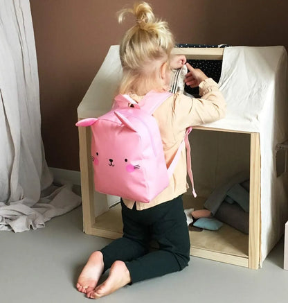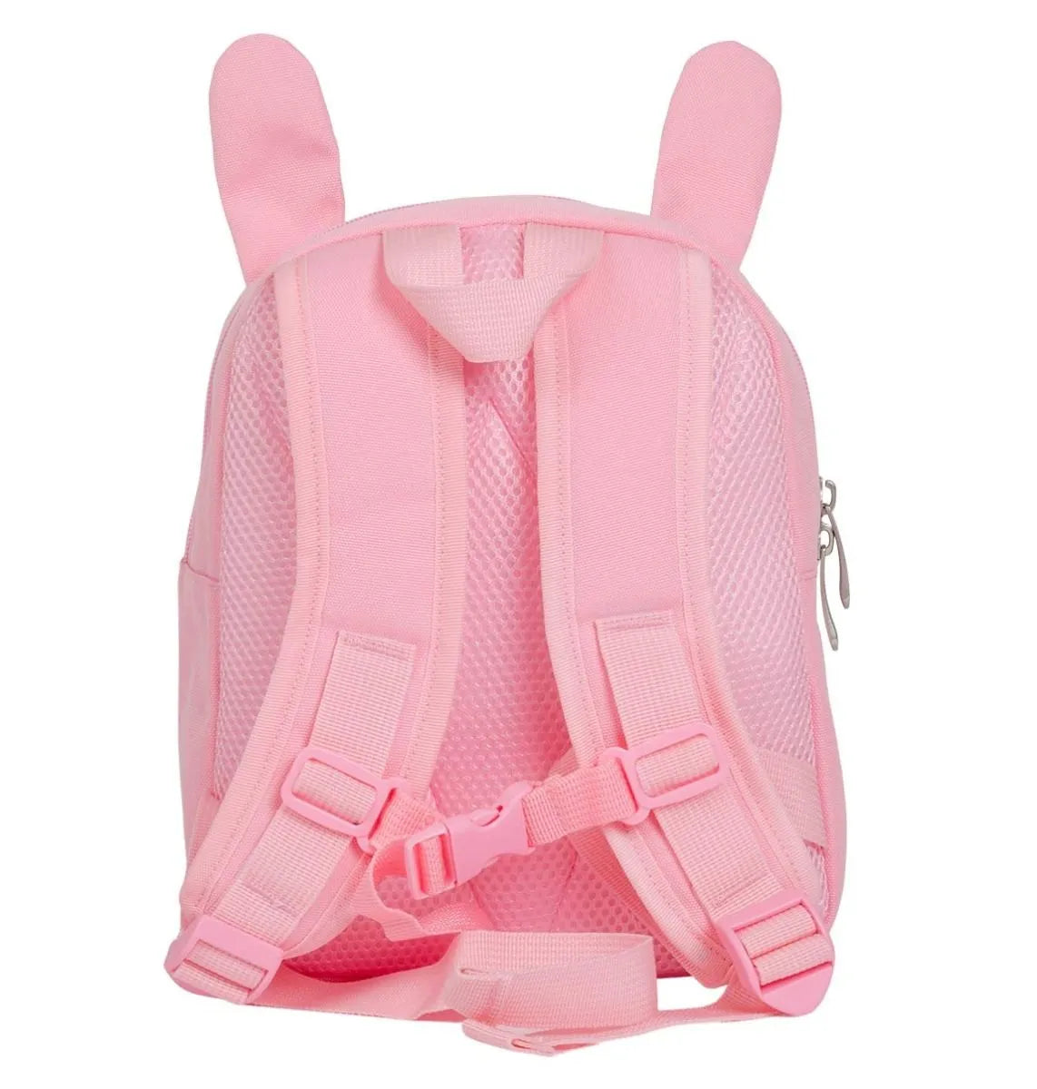 This bunny-shaped backpack is small enough to be carried by even the smallest children. The bag has a main compartment and an additional inner compartment for easily organizing things like a lunch box, books, or sleepover items. The double, split zipper makes the backpack easy to open and close. Thanks to the buckles on the front, the adjustable shoulder straps won't fall off. The sturdy back panel with padding and breathable material ensures extra comfort.