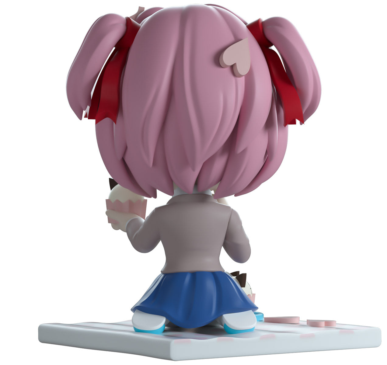 Natsuki returns to Youtooz for her second vinyl figure and a cozy picnic with her best friends! Holding a Kitty Cupcake in her hands and licking the frosting off a raised finger, she sits on her lap at 3.8 inches tall with a tray of delicious cupcakes laid out in front of her. With short pink hair tied with red ribbons, her face is flushed with joy as she wears her school uniform which consists of a light brown blazer over a blue pleated skirt with a red tie at her collar. Each of the girls sits on a section of pink and white polka dot blanket, ready to be displayed next to the other 3 and make the perfect picnic! The outside of her packaging shows a picnic blanket laid out in a quiet field while bright pink flowers flow with the breeze and a picturesque mountain is in the background. The interior is pale green with pink floral patterns, while the protective sleeve is polka dotted with delicious treats laid out on the side while her figurine can be seen through the large clear window on the front. This collectible comes in a protective matte, embossed outer sleeve and a custom-sized plastic protector for maximum protection during shipping.