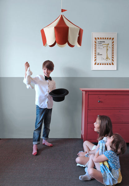 A ceiling lamp in the form of circus. Various colors. Bulb E27 not included. Maximum 100cm cable. LED 14W maximum. This tested.