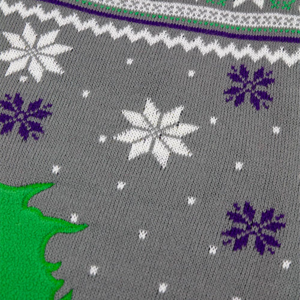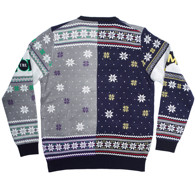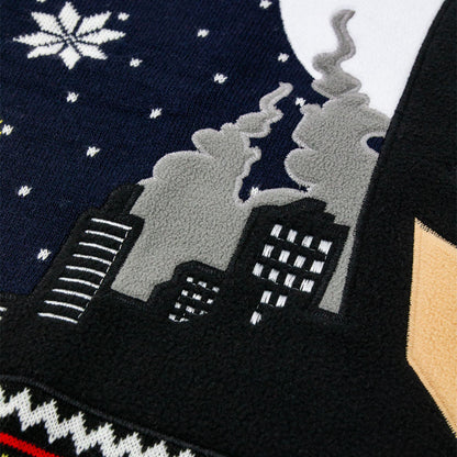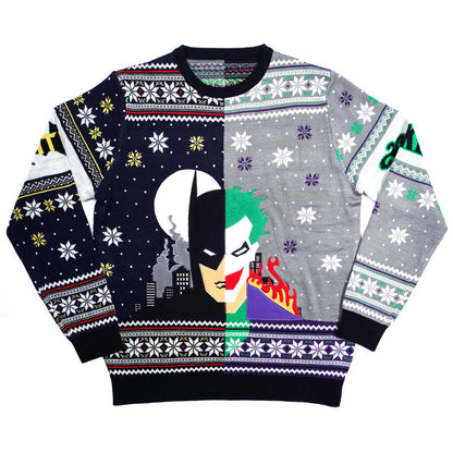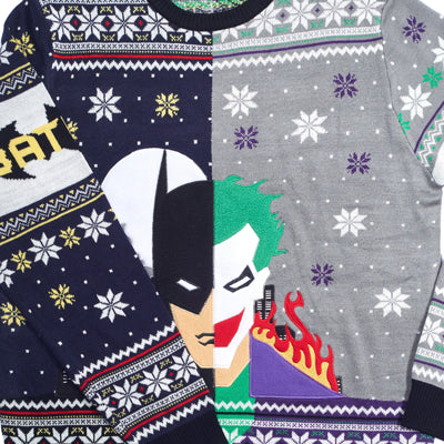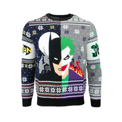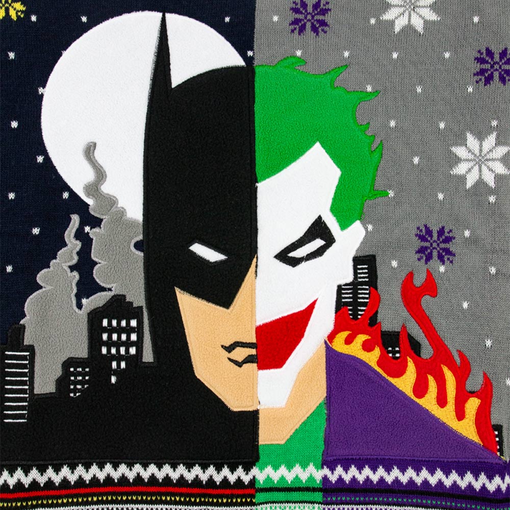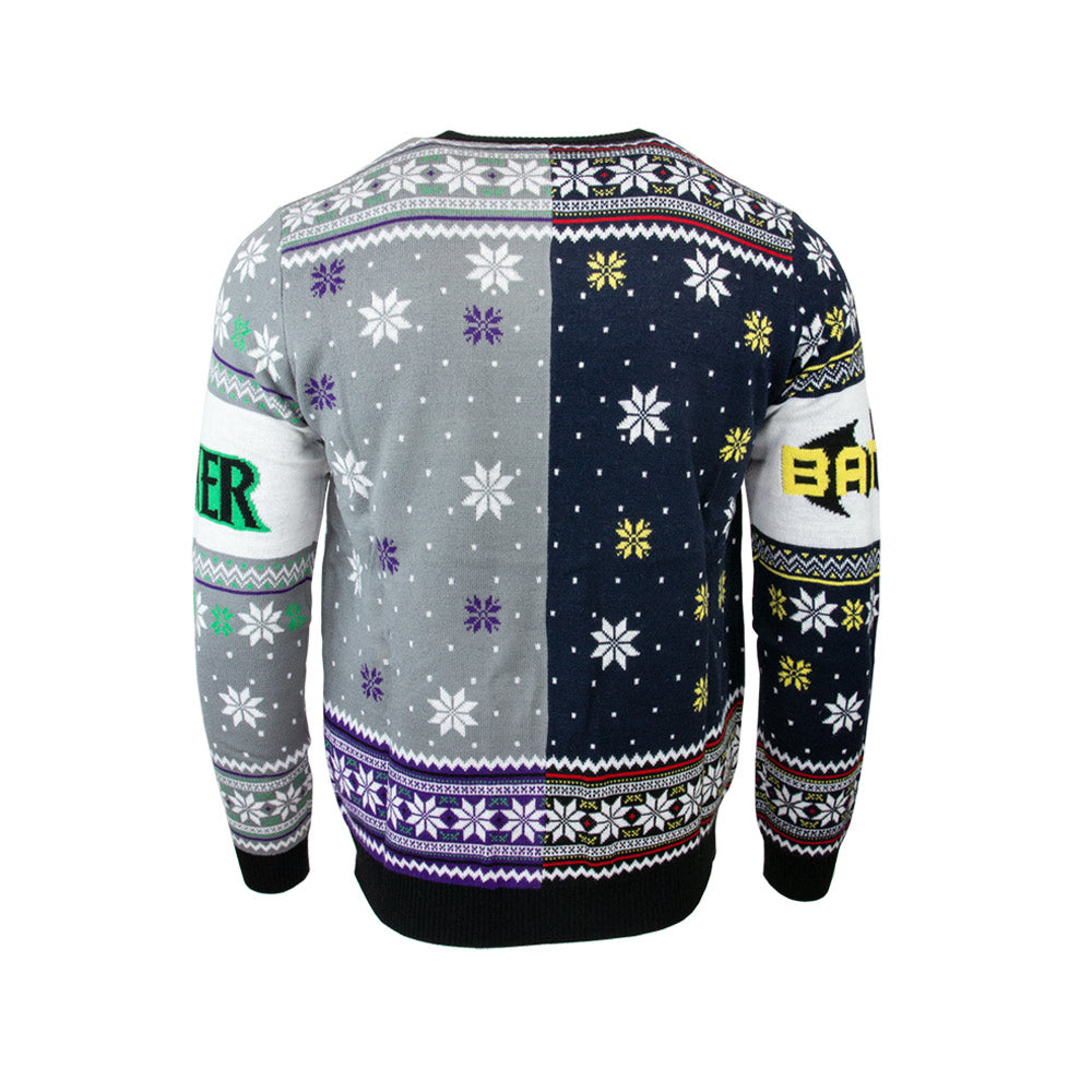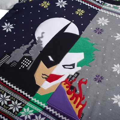 Witness the ultimate showdown between two iconic DC characters this Christmas ! A highly detailed patch embroidery of The Dark Knight and his longtime adversary, The Joker, facing off is featured on the front of the garment. With cute snowflakes and Batman details throughout, this 100% knit sweater is the perfect addition to your wardrobe to protect you from winter chills this holiday season.