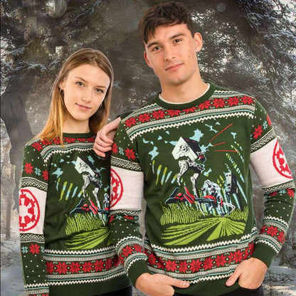 Feel the Christmas Force this year with our range of official Star Wars Christmas jumpers! This Christmas jumper features the infamous Battle of Endor scene, with embroidered designs of an AT-AT and a Stormtrooper battling the Rebels. Wrap up warm and celebrate the holidays (and Christmas!) with our high-quality jumpers!