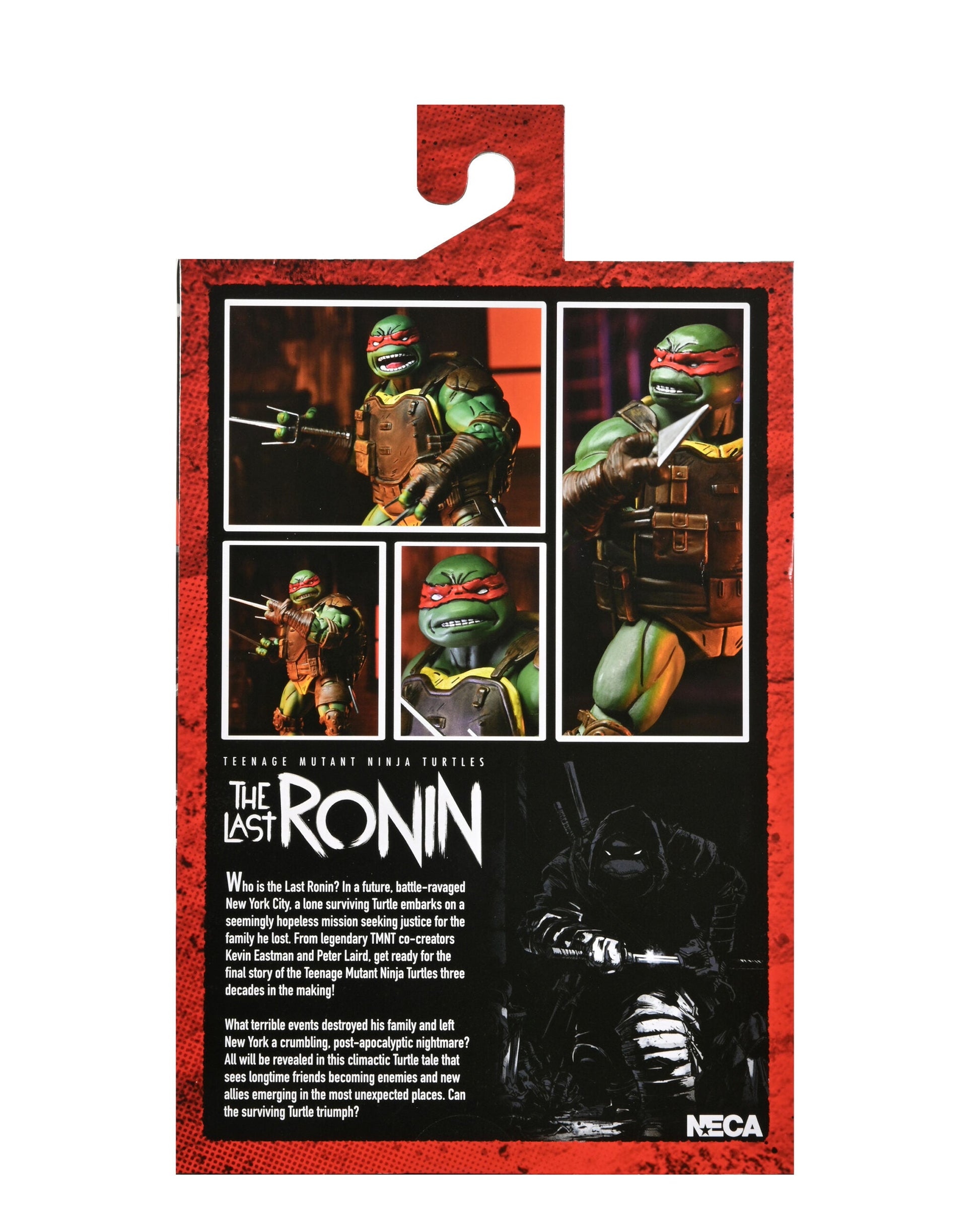 From the Teenage Mutant Ninja Turtles comic series, The Last Ronin! In a future New York City far different than the one we know today; a lone surviving turtle embarks on a seemingly hopeless mission to seek justice for his fallen family and friends. Hot-headed and stubborn, Raphael sets out on a mission of vengeance from which there may be no return. This Ultimate Raphael action figure is authentic to the comic book depiction and stands 7-inches tall with over 20 points of articulation. Includes two interchangeable heads, interchangeable hands, sais, arrow, and throwing knife. Comes in collector-friendly window box packaging with a flap opening featuring custom artwork by The Last Ronin artist Ben Bishop.