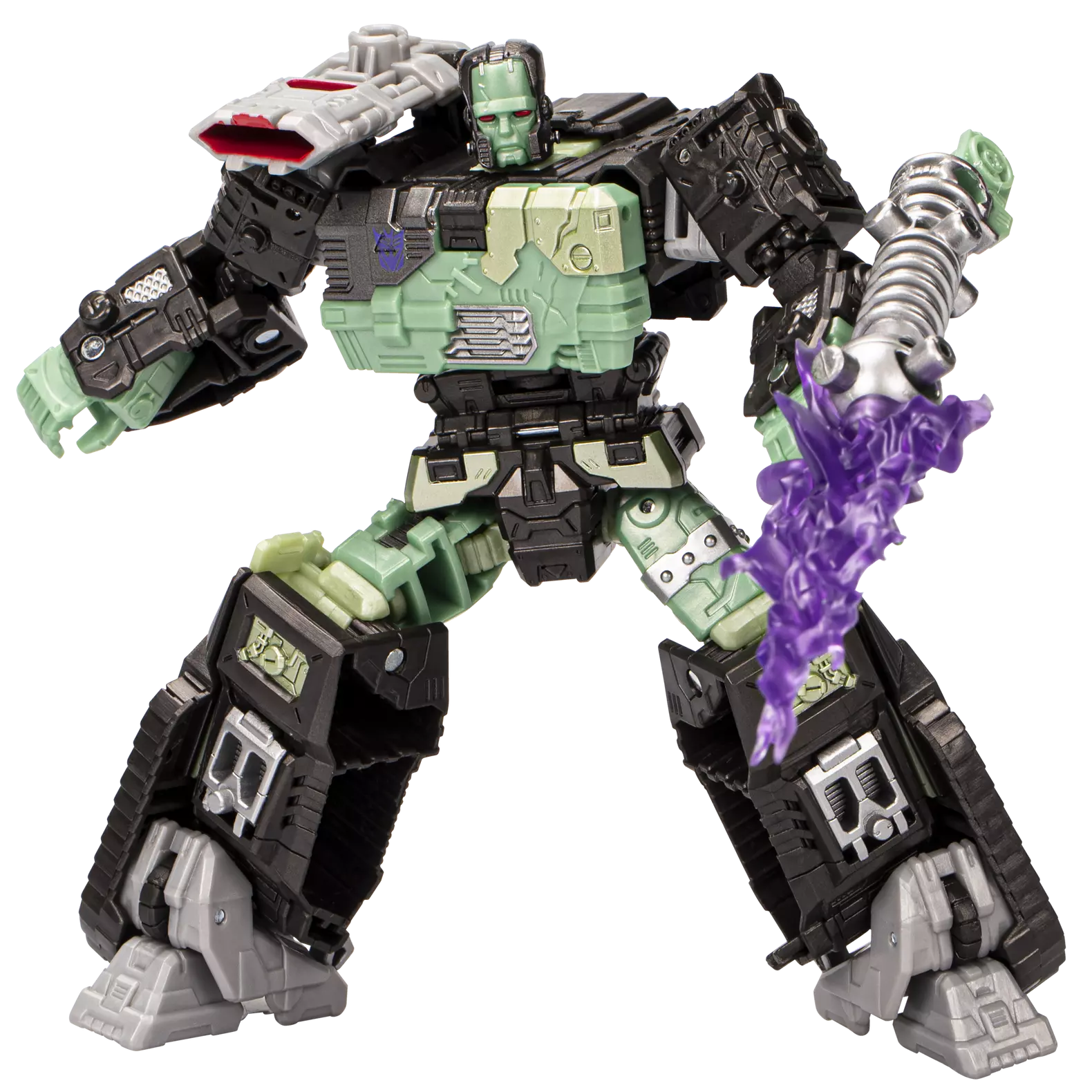 The worlds of Transformers robots and Universal monsters collide with this Frankentron figure from the Universal Monsters Frankenstein x Transformers fusion! Dr. Frankenstein's famous monstrous creation is now a Transformers robot! This figure converts from robot to tank mode and features movie-inspired deco and design. This pack includes a cannon and battle effect. Transformers robots have always been stronger than they appear, except now, thanks to Transformers Collaborative, fans can experience these larger-than-life characters as they fuse and unite with other characters and teams that share that same special quality.