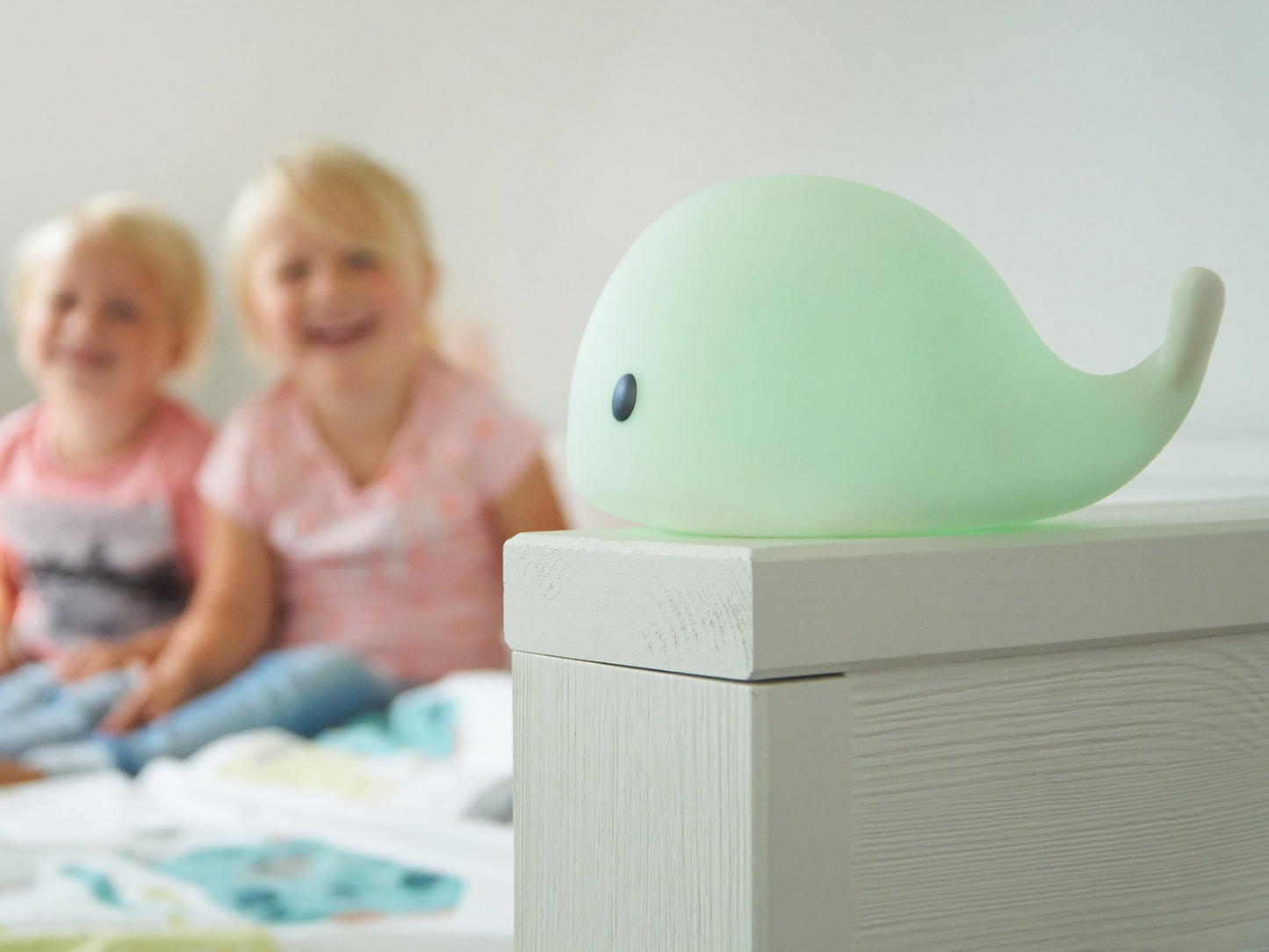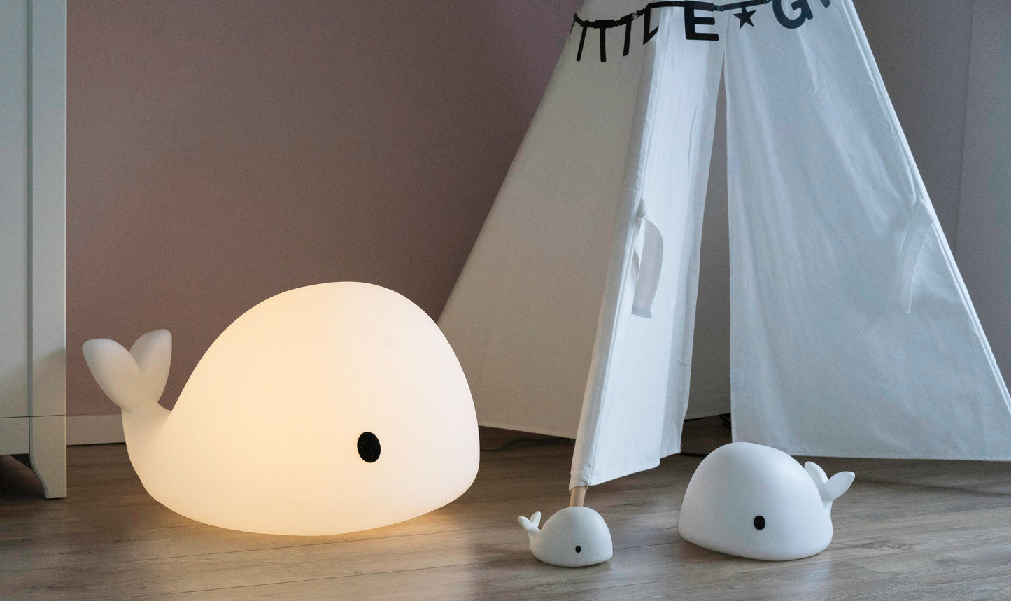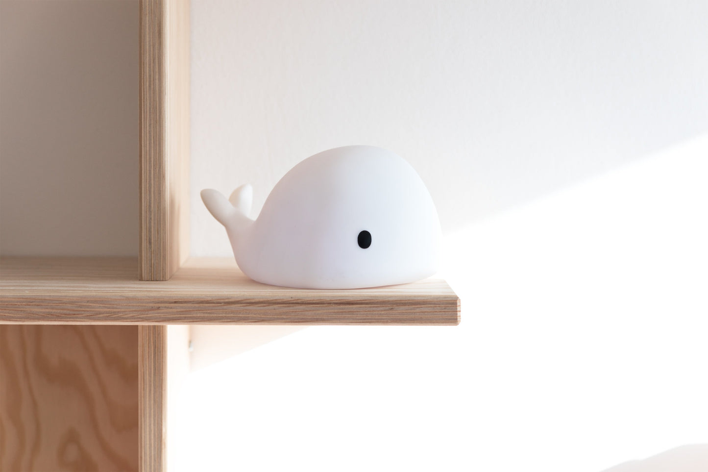 A rechargeable nightmare in the shape of a moby, the whale, in sweet ABS. Turn on the whale by typing on the back, then it changes color (5 different). It can be on all night or be scheduled at 15 minutes.