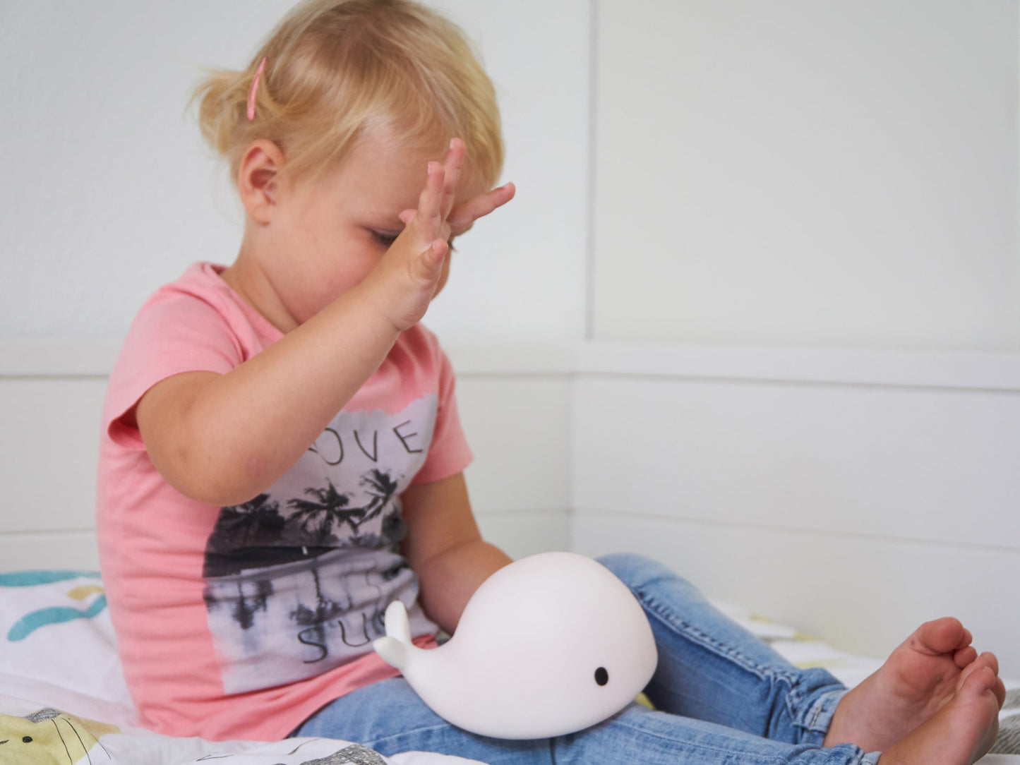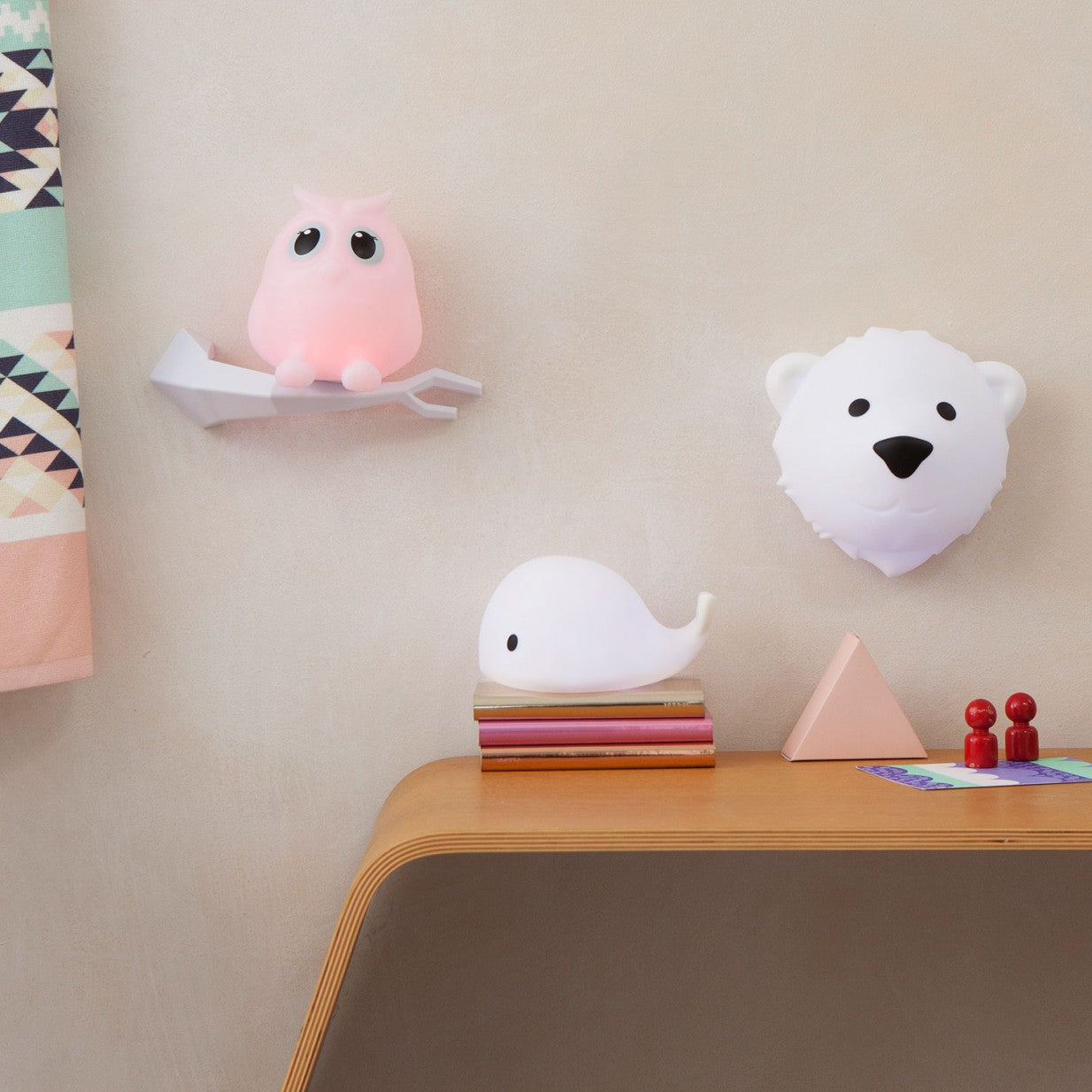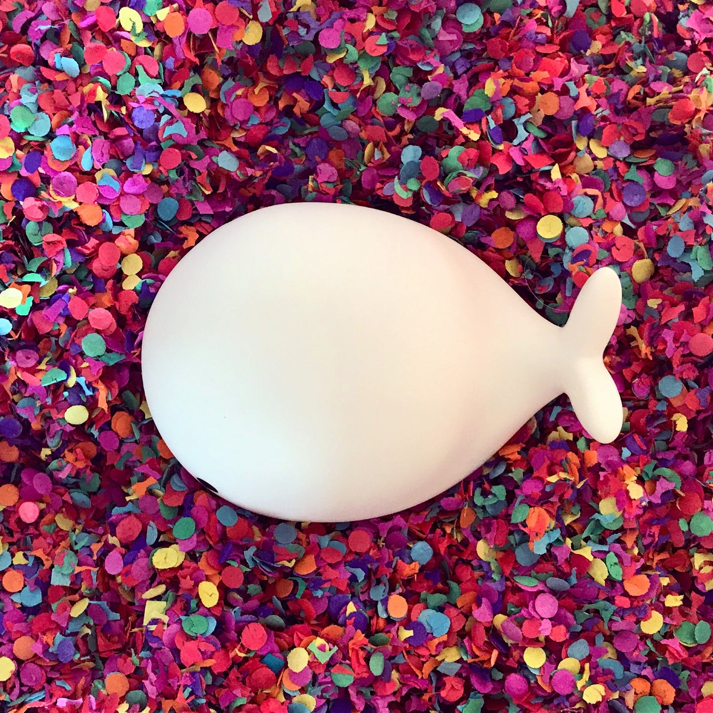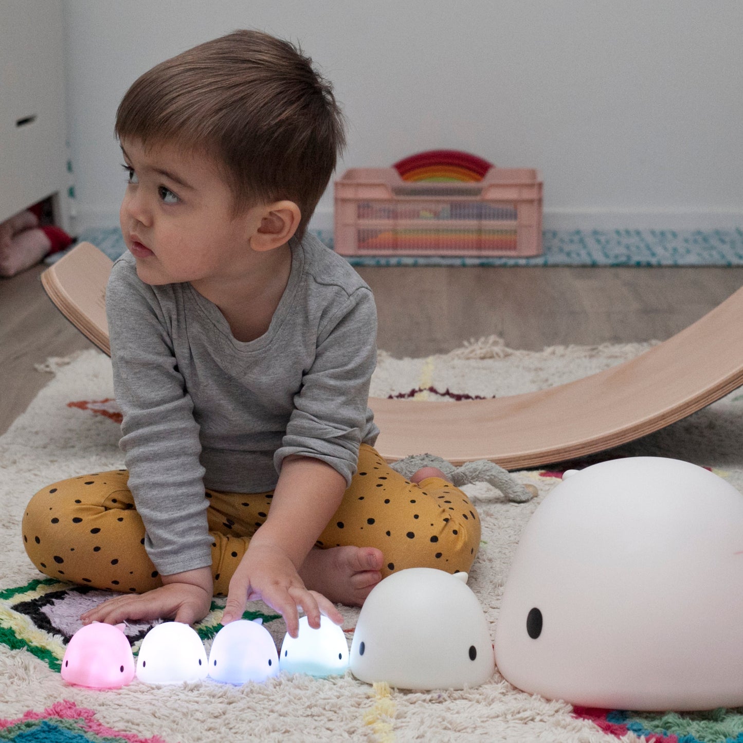 A rechargeable nightmare in the shape of a moby, the whale, in sweet ABS. Turn on the whale by typing on the back, then it changes color (5 different). It can be on all night or be scheduled at 15 minutes.